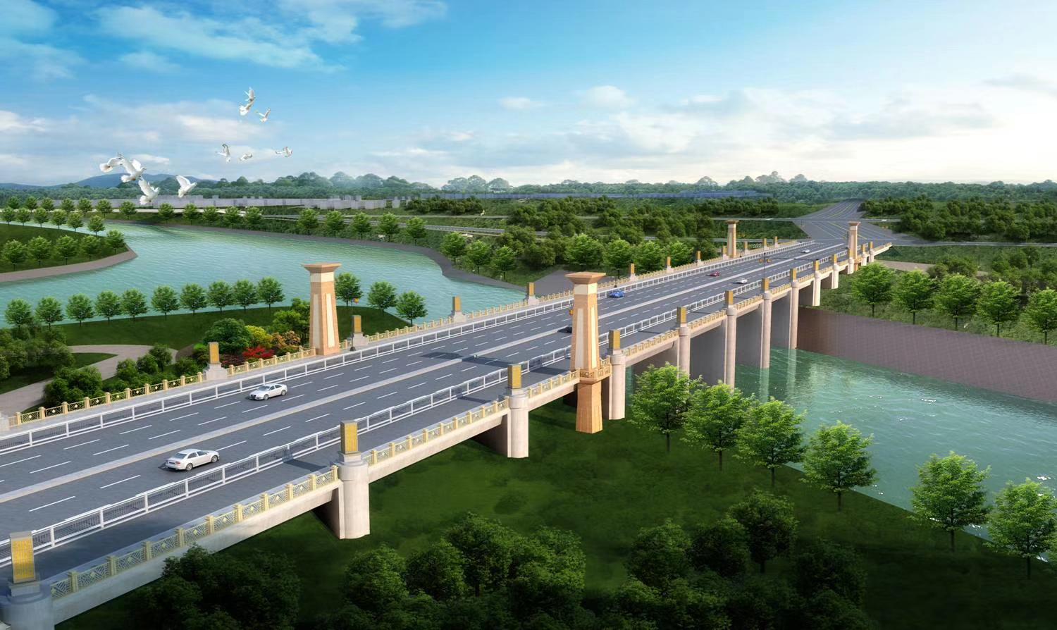 項(xiàng)目位于漯河市西城區(qū)S241南線上,在新開(kāi)挖河道下游。丹江路規(guī)劃為城市主干道,設(shè)計(jì)時(shí)速50km/h,河道中心線與規(guī)劃道路中心線夾角呈130°。