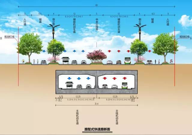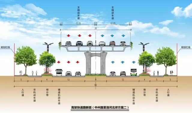 王城大道快速路北起連霍高速洛陽站出口,沿現(xiàn)狀路向南,與新310國道、機場路設(shè)置樞紐型互通立交,跨越規(guī)劃北環(huán)路后,以地道方式連續(xù)下穿老310國道、魏紫路、狀元紅路,與現(xiàn)狀漢宮路即瀍澗大道設(shè)全互通立交,繼續(xù)向南跨越隴海鐵路,進入洛陽城市核心區(qū),與紗廠西路設(shè)樞紐型互通立交,之后向南以高架橋的方式穿越現(xiàn)狀洛陽城市核心區(qū),與九都路設(shè)置樞紐型互通立交;繼續(xù)向南跨越洛河橋后,進入洛龍新區(qū),與古城路設(shè)置樞紐型互通立交,下穿開源大道、牡丹大道后,上跨關(guān)林路、伊洛路,并與伊洛路設(shè)置互通立交,終點與南環(huán)李屯特大橋銜接。線路全長19km。